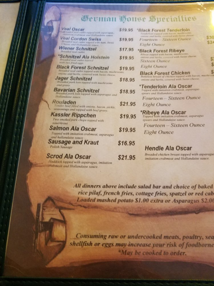 Introducing the menu at Bavarian Inn, located in Lena, WI, is a delightful experience for lovers of German and American cuisine. Offering a range of German meals alongside traditional steak and seafood options, this restaurant impresses with its authentic flavors and cozy ambiance. The Schnitzel Trio stands out as a must-try dish, showcasing the variety of schnitzel options available. The well-stocked build-your-own salad bar adds a healthy touch to the meals, while sides like sauerkraut, spatzel, and potato complement the main courses perfectly. The bar boasts a wide selection of martinis and specialty drinks, making it a popular spot for patrons to unwind. With friendly bartenders and top-notch service, Bavarian Inn is a go-to destination for a memorable dining experience.